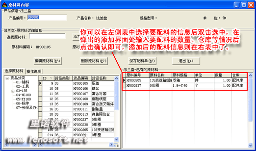 當你操作原料配件區(qū)的新增原料區(qū)的時候,會出現(xiàn)詳細的原材料內(nèi)容添加界面。你可以在左側(cè)表中選擇要配料的信息后雙擊選中,在彈出的添加界面處輸入要配料的數(shù)量、倉庫等情況后點擊確認即可,添加后的配料信息則在右表中了。