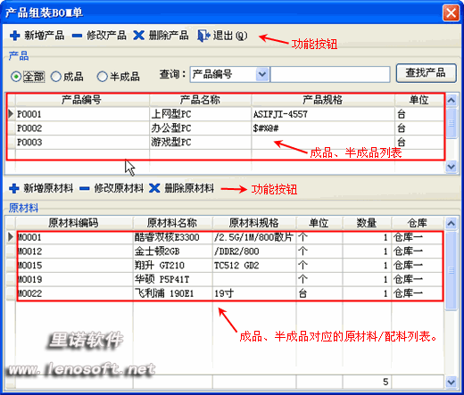 上面成品半成品信息是對成品半成品的操作,可以直接點擊新增產品、修改產品、刪除產品來添加、刪除、修改;您要生產的產品的信息。上面的全部產品、成品、半成品是對所要生產的產品列表來進行過濾,或者直接在查找框里輸入產品相關信息來進行查找。