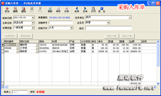 ①采購入庫:當收到鋼材資料時,可以通過入庫登記編制單據,同時庫存數量及金額增加,配合采購報表即可查閱各往來單位、各倉庫的匯總報表。